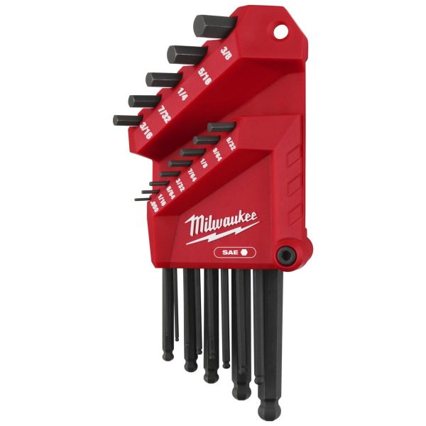 13-delt unbrakonøglesæt med tommestørrelser (Allen-nøgler). Rund ende giver adgang til skruen i en vinkel på op til 30°.