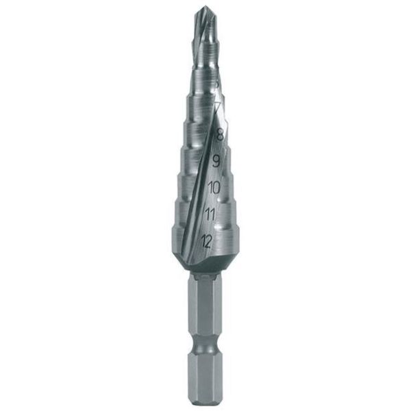 Varenr.: 2790026Trinbor med 1/4" bitbeslag. Boret er CBS-slebet for høj varmebestandighed og har størrelsesmærkning på hvert trin.
