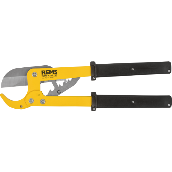 REMS ROS P 75 P er en rørskærer, der skærer plastrør op til Ø75 mm, Ø 21/2" og har et endestopgreb til kraftig skæring. Specielt hærdet og jordblad og retvinklet, burrless cut. Rørskæreren REMS ROS P 75 P efterlader ingen spåner tilbage i røret.