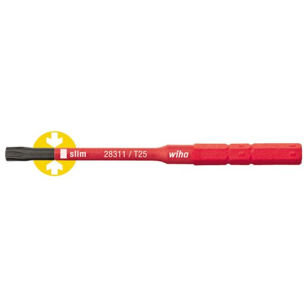 Wiha Torx slimBit med en længde på 75 mm og 6 mm-fæste, til arbejde i nærheden af spændingsførende dele op til 1 000 V AC. Skal kun bruges i bitsholderen slimVario samt slimTorque VDE. Hos Wiha slimTECHNOLOGY, der er udviklet særligt til elarbejde, blev beskyttelsesisolereringen indbygget i klingen for at muliggøre op til 33 % smalere klinger. På den måde kan også dybbeliggende skruer og fjederelementer nås med slimBit uden problemer. De isolerede slimBit-bits gennemgår en stykkeprøvning i henhold til den internationale standard IEC 60900 og muliggør sikkert arbejde i nærheden af spændingsførende dele op til 1 000 V AC.