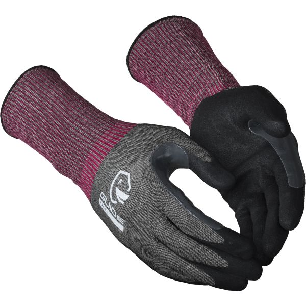 GUIDE GLOVES 6606 er en handske med Guide HXFIBR™-fiber, der kombinerer fremragende skæreværn og fingertopfølelse. Handsken har ekstra lang manchet til udvidet beskyttelse og nitrilbelægning for et godt greb og høj smidighed. Skæreværnsniveau F, udvidet forstærkning ved tommelen og pegefingeren. Godkendt til kontaktvarme niveau 1. ESD og fødevaregodkendt. ØKO-TEX-godkendt. Touchscreen-kompatibel.