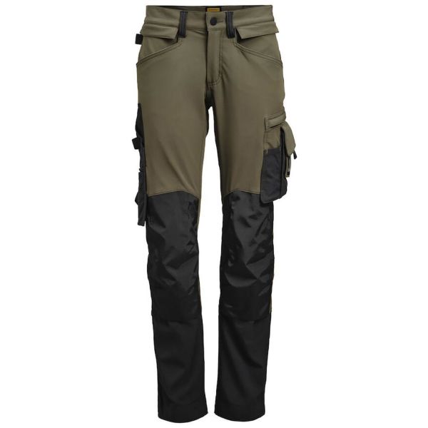 Arbejdsbuks i damemodel i 4-vejsstretch med partier af slidstærkt vævet stof ved buksebenets afslutning, benlommer og hylsterlommer.