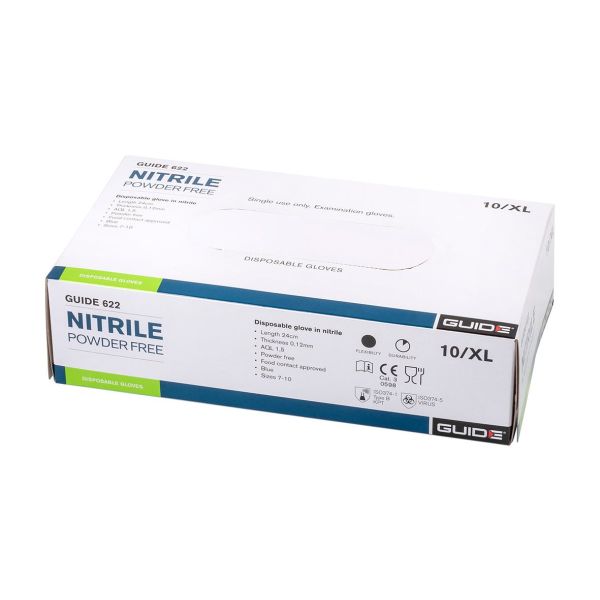 GUIDE GLOVES 622 er en alsidig og fødevaregodkendt nitrilhandske til engangsbrug med struktureret overflade for bedre greb. Pulverfri.