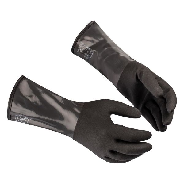 GUIDE GLOVES 9404W er en kemikalieresistent handske til præcision og alsidigt arbejde. Doppet i to-lags væsketæt nitril- og PVC-blanding. 35 cm lang sikkerhedskrage. 18-ga nylonforing med vinterforing af akryl til en blød og behagelig fornemmelse. God fingertopfølelse. Type A godkendt. Godkendt til kontaktvarme niveau 2.