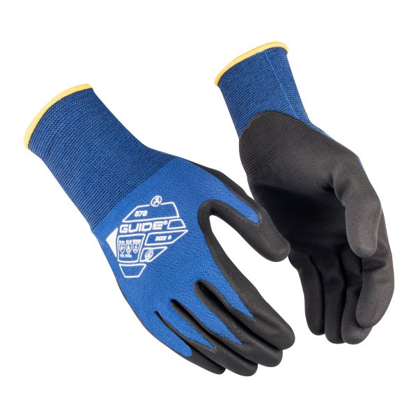 GUIDE GLOVES 578 HP er en tynd arbejdshandske med rigtig god fingerfølelse i fingerspidserne. Strikket i nylon og kolfiber, som eliminerer risikoen for opladning af statisk elektricitet, hvilket kan skade moderne teknologi. Håndfladebelagt i nitril, mikrofoam, som giver et meget godt tørt greb og en barriere mod væde. Godkendt til kontaktvarme niveau 1. OEKO-TEX godkendt. Touchscreen-kompatibel. Antistatisk.