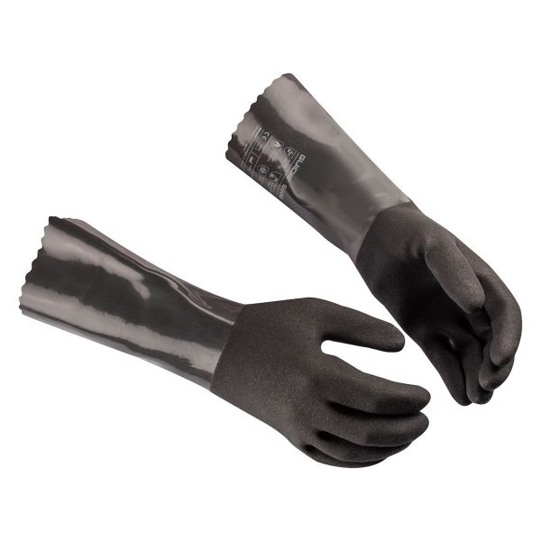 GUIDE GLOVES 9405 er en kemikaliebestandig handske til præcision og alsidigt arbejde. Dyppet i to lag væsketæt nitril- og PVC-blanding. 35 cm lang sikkerhedsmanchet. 15 g para-aramidforing for en blød og behagelig følelse. God fingerfølelse i fingerspidserne. Type A-godkendt. Skæresikringsniveau C. Godkendt til kontaktvarme niveau 1.