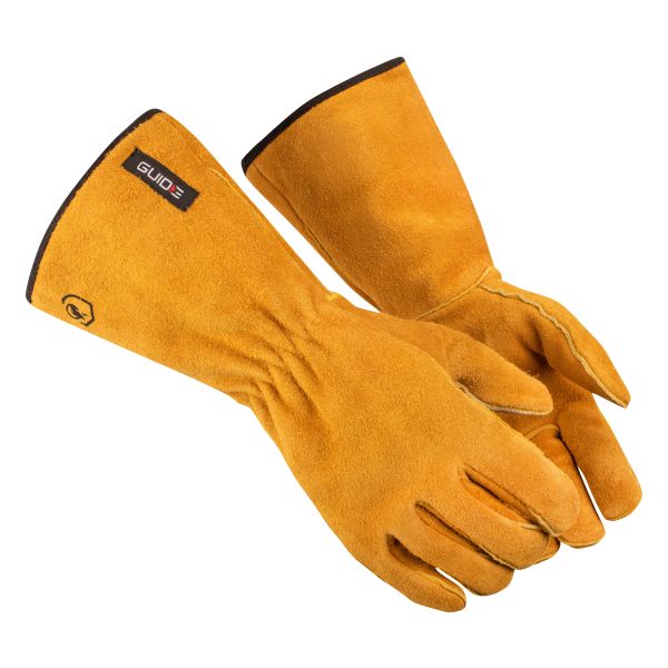 GUIDE GLOVES 3569 er en svejsehandske i splitlæder af højeste kvalitet med bomuldsfor, udstyret med manchet og elastik ved håndleddet. Fremstillet til arbejde i varme miljøer, godkendt til kontaktvarme op til 100 °C, egnet til MIG- og MAG-svejsning. Sømme af varmetålig kevlartråd.