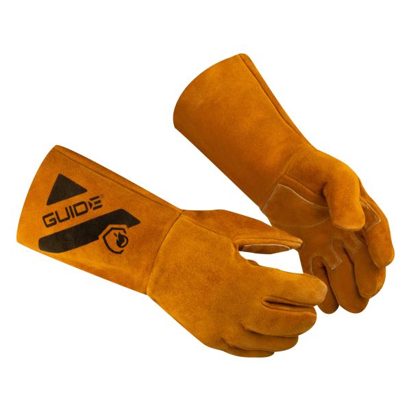 GUIDE GLOVES 3570 er en svejse- og varmebeskyttelseshanske i splitlæder af højeste kvalitet. Handsken er udstyret med lang manchet, forstærkninger i indersiden af hånden og med bomuldfoder. Udviklet til arbejde i varme miljøer, velegnet til MIG- og MAG-svejsning. Sømme af varmebestandigt Kevlartråd.