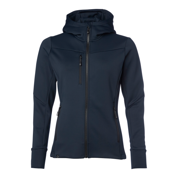 Blød og funktionel powerfleece med fleece inderside. Hætte med høj krave og skråt bærestykke. Brystlomme og to sidelommer med lynlås. Ekstra høje manchetter ved ærmeafslutning og justerbar underkant med elastisk snøre.