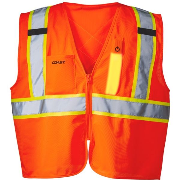 Coast SV350 er en genopladelig sikkerhedsvest i orange hi-vis farve med integreret LED-belysning, der hjælper dig med at gøre din tilstedeværelse kendt. Vesten er lavet af et ANSI klasse 2 mesh-stof, der er forstærket med tofarvet retroreflekterende tape. Udstyret med genopladelig LED-sikkerhedsstrimmel for øget synlighed. LED-strimlen kan tages af, når vesten f.eks. skal vaskes. LED-belysningen kan placeres på forsiden eller bagsiden af vesten og har en driftstid pr. opladning på 10 timer i konstant lys og 12 timer i blinkende lys. Designet til at øge sikkerheden i miljøer med uforudsigelig belysning, såsom på byggepladser eller i trafikkontrolpunkter. Denne vaskbare vest er også udstyret med to stropper på skuldrene, hvor brugeren kan fastgøre værktøj, radioer eller andre instrumenter. Coast SV350 har også en reflekterende stofstrop i nakken til clip-on sikkerhedslygter, en rummelig indvendig brystlomme, en brystlomme på ydersiden af vesten og en lynlås foran på vesten. SV350 sikkerhedsvesten fra Coast opfylder ANSI- og CSA-standarderne.