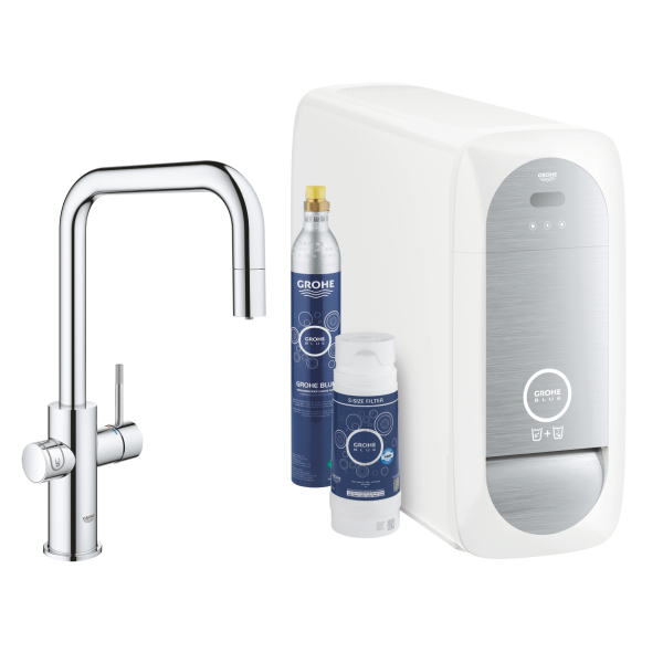 Minsk dit affald og nyd ultimativ bekvemmelighed. Skift flaskevand ud med en smart køkkenarmatur, der leverer nedkølet og filtreret vand efter behov. Startkittet GROHE Blue Home Duo indeholder alt, hvad der er nødvendigt for at få glæde af filtreret og afkølet vand. Vælg mellem stille vand, let mousserende eller med masser af brus. Med GROHE Ondus-appen** kan du med denne opkoblede/forbundne version tappe vand via din smartphone***, overvåge dit forbrug og bestille filter samt CO2-flasker. Indstillinger kan justeres eksternt via mobiltelefonen, og vandstatistik kan kobles sammen med forskellige sundhedsapps. Sættet består af et GROHE Blue-etgrebsarmatur og en energibesparende køleenhed, som indeholder filter og CO2-flaske. Køleenheden passer i skabe, der er mere end 30 cm brede – hvilket gør, at den passer perfekt i alle køkkener. Både filteret og CO2-flasken på 425 gram er lette at fjerne og udskifte. Med et Blue Home Duo-armatur får du også alle fordelene ved et veldesignet, klassisk køkkenarmatur fra GROHE. Den praktiske, høje tud med 150° svingradius skjuler indvendige vandveje, der adskiller filtreret og ufiltreret vand. Grebet giver almindeligt hanevand, men for at aktivere filter-, køle- eller brusfunktion trykker du blot på den oplyste LED-knap. LED-displayet viser også, når patronen skal udskiftes. Med GROHEs elegante linjer har dette køkkenarmatur desuden en skinnende GROHE StarLight-kromoverflade samt en holdbar GROHE SilkMove-patron for jævn, glidende betjening. Alt i kittet er klart til brug, og der er ikke behov for eksterne rør og slanger, hvilket giver en hurtig installation, der kun tager 30 minutter.