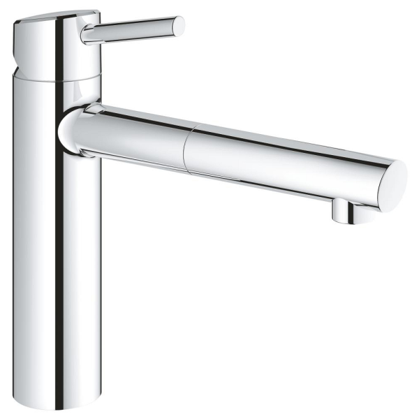 Denne køkkenarmatur i GROHE Concetto-serien er en perfekt kombination af praktiske funktioner og høj komfort i et elegant, stilrent design. Køkkenarmaturet har rene linjer og er forsynet med den skinnende, kromblanke GROHE StarLight-overflade. Det er fremstillet med en mellem-høj tud, som kan drejes let med en radius på 100°, og er desuden udstyret med en række praktiske funktioner. Det begrænsede svingområde forhindrer, at tuden rammer omkringliggende vægge eller skabe. Armaturet er desuden udstyret med et praktisk, udtrækkeligt brusehoved, som er ideelt til opvask af gryder og kasseroller eller rengøring af køkkenvasken. Det er konstrueret med GROHE SilkMove-teknologi, som giver jævn og trinløs regulering af vandmængde og temperatur. En perfekt kombination.