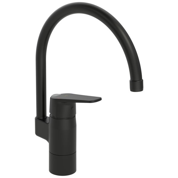 Varenr.: 3093441Køkkenbatteri i mat sort med høj udløbsrør, svingbart udløb og strålesamler. Udløbsrørets drejeradius er forudindstillet til 120° (kan begrænses til 0° eller 60°).