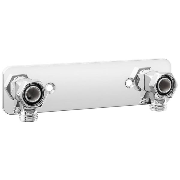 Trio Perfect Design Line 8352213 er et mixerbeslag med forkromet overflade, beregnet til synlige rør. Vandhanetilbehøret er designet til at passe ind i moderne vådrumsinteriør og har et stilfuldt look med blødt afrundede hjørner. Grundmaterialet er messing, hvilket giver produktet en solid følelse af kvalitet. Beslaget forbindes med planforsegling til halvkoblinger. Har en måling på 54 x 210 x 40 mm (H x B x D) og mixerforbindelserne er udstyret med indvendigt gevind i form af M26x1.5. VVS-skrue til montering medfølger.