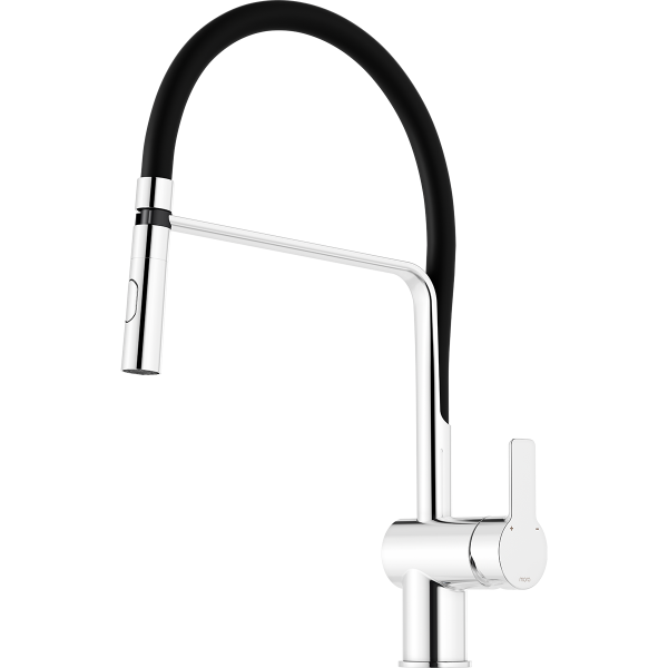 Forkromet køkkenbatteri fra Mora med fleksibelt udløb samt 2-stråle mundstykke med koncentreret stråle og håndbruser. Svingbart udløb 60°, 85°, 110° eller 360°. Indbygget, let justerbar flowbegrænsning og temperatursperre. Fleksible tilslutningsrør i metalomviklet Soft PEX®, G3/8. Et blyfrit blandebatteri med hulmål Ø34-37 mm.