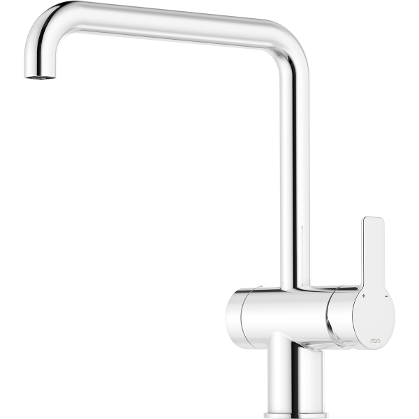 Tidløs, minimalistisk køkkenarmatur i krom. Den har en elegant, cylindrisk profil, en let buet tud og et karakteristisk fladt greb. Med opvaskemaskinafbryder, som mindsker risikoen for vandskader.