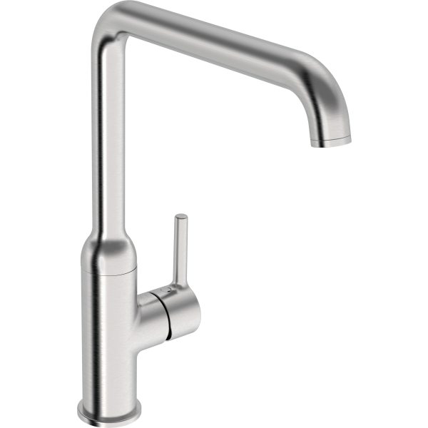 Varenr.: 4052301Køkkenarmatur, børstet stål, med tandgreb, høj drejelig J-tud og belufter. Udgangstudens drejeradius er forudindstillet til 120° (kan begrænses til 0°/60°/360°).