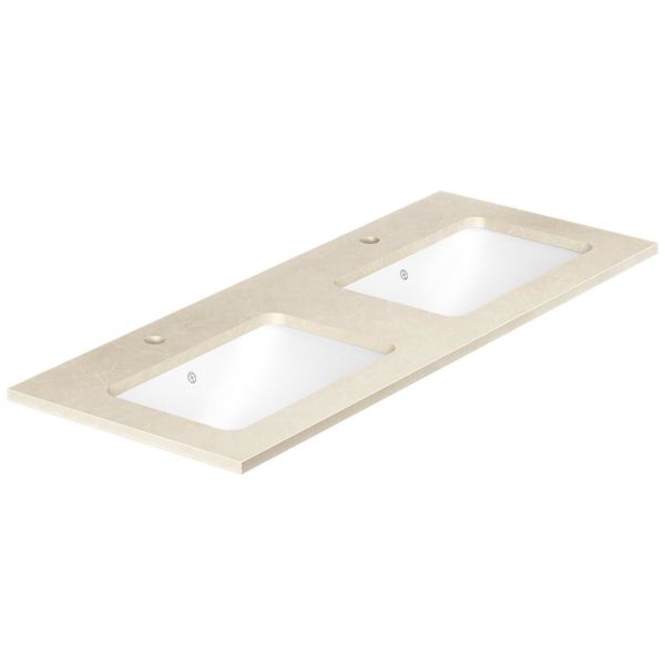 Varenr.: 4076309Beige bordplade i kompaktsten med to underlimede vaske i porcelæn, passer Ducentic-kommoder. Skiven har en bredde på 120 cm og to blandehuller (1+1) til to enkelhulsblandebatterier.