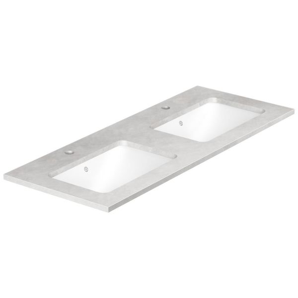 Varenr.: 4076311Grå bordplade i kompaktsten med to undermonterede håndvaske i porcelæn, passer Ducentic-kommoder. Skiven er 120 cm bred og har to blandebatterihuller (1+1) til to ét-hul-blandebatterier.