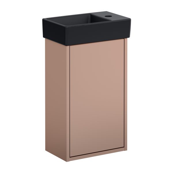 Gustavsberg Artic Small håndvaskskab i farverne askgrå/sort. Skabet har en dør med Soft Close for blid, lydsvag lukning samt udskæring til gulvafløb. Vask til venstre.