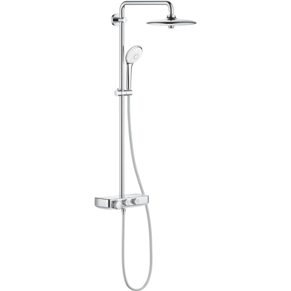 Grohe Euphoria SmartControl System 260 er et brusesæt med termostat til vægmontering. Sættet indeholder en vandret brusearm på 450 mm, en SmartControl termostat, en hovedbruser med tre strålemønstre (Rain, SmartRain, Jet), en håndbruser med tre stråletyper (Rain, SmartRain, Massage), justerbar højde med glideelementer og en bruseslange. Brusesystemet har funktioner som GROHE DreamSpray, GROHE Cooltouch, GROHE TurboStat kompakt indsats med voksbaseret keramisk krop og GROHE EcoJoy vandbesparende teknologi.