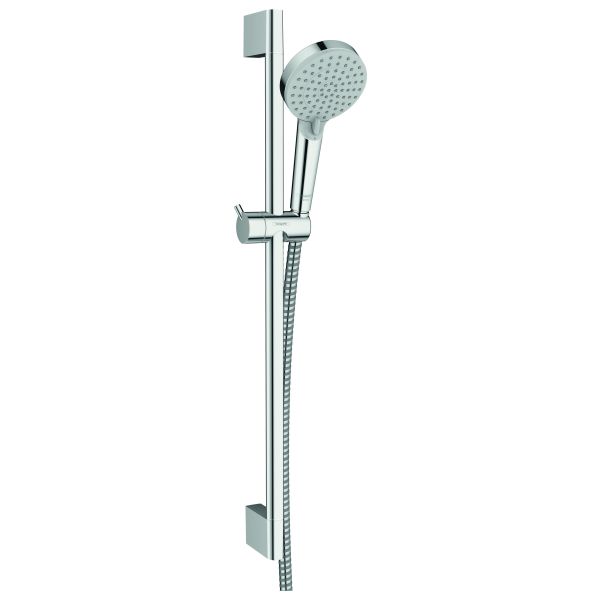 Hansgrohe Vernis er et brusesæt bestående af håndbruser, brusestang, bruseslange og skydebeslag. Brusestangen Crometta er 65 cm. I krom/hvid.
