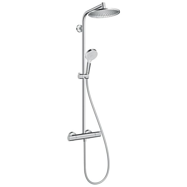 Hansgrohe Crometta S 240 loftbrusesæt 150 c/c bestående af hovedbruser, håndbruser, brusetermostat, bruseslange, skydebeslag og brusestang.