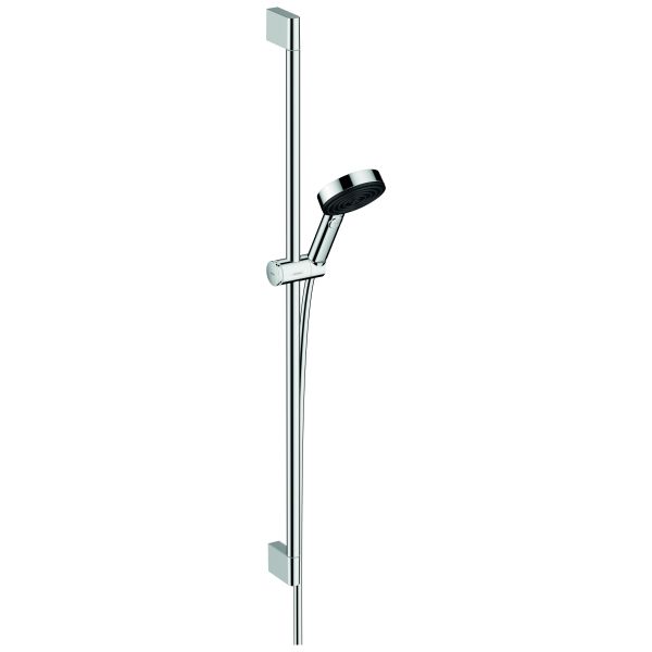 Hansgrohe Pulsify Select S 105 er et forkromet brusesæt, der indeholder en håndbruser med tre stråletyper, brusestang på Ø22x900 mm, bruseslange med dobbeltsidet konisk møtrik og glidebeslag. Den medfølgende hovedbruser har en brusehoveddiameter på 105 mm. Skift af stråletype udføres bekvemt med knappen Vælg.