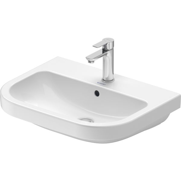 Duravit D-Code håndvask, hvid højglans, rund, antal vaskeflader: 1 centreret, armaturhulsliste: ja, antal huller til armatur pr. vaskeflade: 1 centreret, overløb: ja, underside fuldt glaseret, glaseret bagside: nej, 600 mm