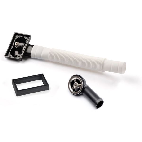 Universal overløbsafløb til tilslutning til vask, bundventil og kurvventil. Med to overløbsafløb med tilslutning. Til rektangulært 52 x 27 mm hulmønster eller cirkulært Ø31 overløbsafløbshul og fleksibel slange 350 mm,