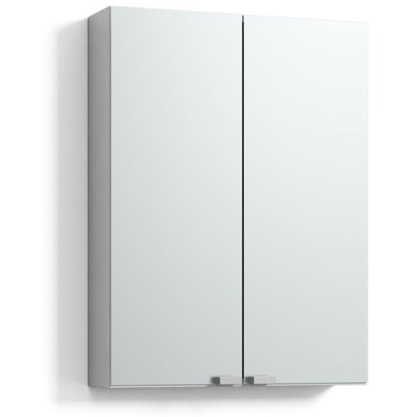 Spejlskab med 2 hylder, låge med fuldt spejlglas indvendigt og udvendigt. Fremstillet af galvaniseret metalplade behandlet med en zink/jernlegering. Pulverlakeret for god ridsefasthed og fremragende korrosionsbeskyttelse. Uden belysning.