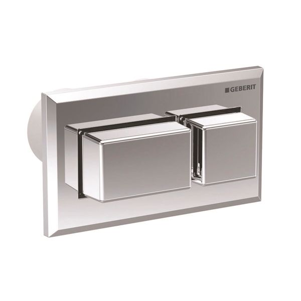 Pneumatisk rektangulær skylleknap til Geberit Sigma, Omega og Delta. Kan placeres op til 1,7 m fra WC-skålen.