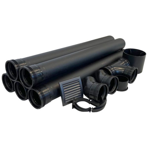 Et komplet ventilationskit, der sikrer, at frisk luft tages ind gennem ydervæggen bag toilettet, mens afgasser føres ud gennem væggen, rundt om tagfoden og videre op over taget.