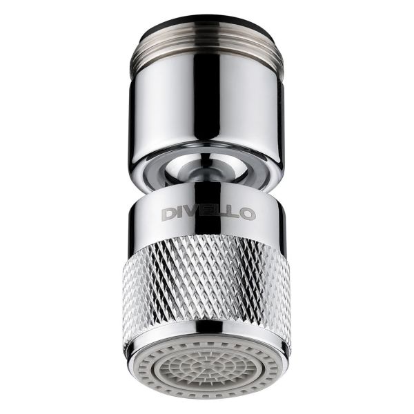 Strålesamler med kugleled til køkkenarmatur (indv. gevind M22 x 1 mm eller udv. gevind M24 x 1 mm). DIVELLO ECONOM™: Armaturuafhængigt og energieffektivt originalprodukt, reducerer vand- og energiforbruget på eksisterende tappesteder med op til 60 %. DIVELLO DYNAMIC S-TECH™: Forbedret vandkomfort – konstant vandflow uanset højt eller lavt vandtryk. Sikrer, at det ønskede vandflow leveres i hele ejendomsporteføljen, selv om vandtrykket varierer i byområder, ejendomme og afhængigt af belastningen på vandforsyningsnettet. Oplev et kraftigt strålebillede med optimal skyllekomfort. Kalkafvisende inderdele. Shower Spray: Skift mellem traditionel stråle og brusestråle via en skånsom drejeregulering.