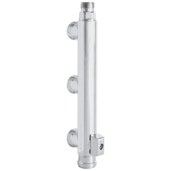 Distributør 3-vejs 60cc designet til montering på vægskive med G15-tilslutning. Med G10 udvendigt gevind på toppen til tilslutning af f.eks. halvkobling eller tilslutningsslange med legemøtrik og planpakning. Forkromet.