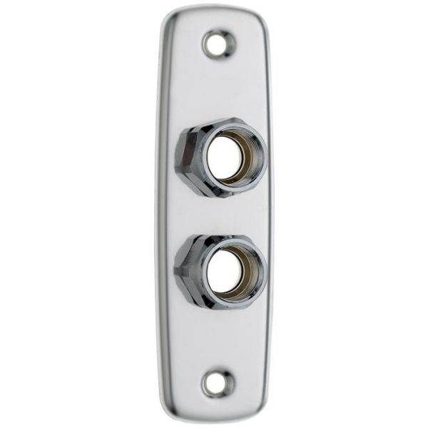 Varenr.: 23628742-hullers vægvasker i rustfrit stål med poleret overflade og indvendigt G15-gevind. Til rørtype 16×2,0-2,2 Pex/Alupex/Pb. Skivens dimensioner er 150 x 45 mm, og skruehullerne har en afstand på 120 mm. Koblingssæt medfølger.