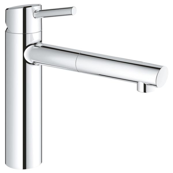 Denne køkkenarmatur i GROHE Concetto-serien er en perfekt kombination af praktiske funktioner og høj komfort i et elegant, stilrent design. Køkkenarmaturet har rene linjer og er forsynet med den skinnende, kromblanke GROHE StarLight-overflade. Det er fremstillet med en mellem-høj tud, som kan drejes let med en radius på 100°, og er desuden udstyret med en række praktiske funktioner. Det begrænsede svingområde forhindrer, at tuden rammer omkringliggende vægge eller skabe. Armaturet er desuden udstyret med et praktisk, udtrækkeligt brusehoved, som er ideelt til opvask af gryder og kasseroller eller rengøring af køkkenvasken. Det er konstrueret med GROHE SilkMove-teknologi, som giver jævn og trinløs regulering af vandmængde og temperatur. En perfekt kombination.