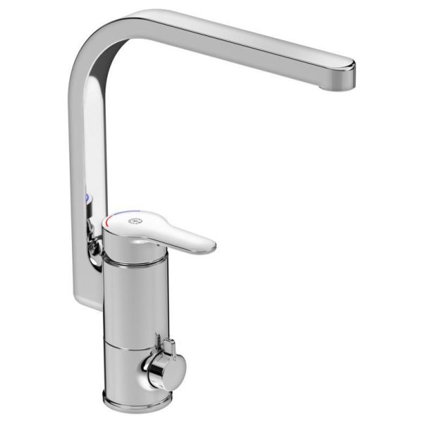 Gustavsberg Nordic3 etgrebs køkkenbatteri med høj tud og opvaskemaskineaflukning. Køkkenbatteriet har et 110° svingbart udløb, der kan låses ved 0° eller 80°. Udstyret med justerbar maksimalflowbegrænsning (ECO-stopp) og justerbar maksimaltemperatur for at undgå skoldning.