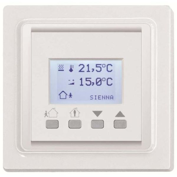 Powerline termostat med display, hvid, 50x50mm til rammemontering. Med kontrolstik 3 A/250 V AC til direkte tilslutning til varme-/køleelementer. Belyst display. Strømforbrug i standbytilstand kun 0,4 watt.