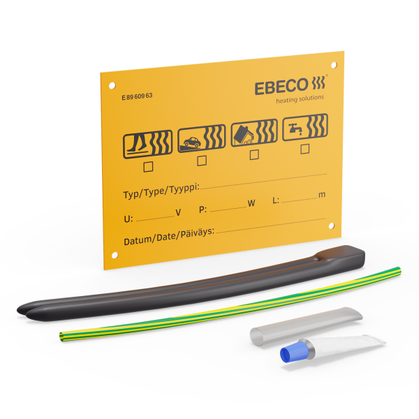 Evebo 8960419 er et an-/termineringssæt til F10, silikone. Med dette komplette silikoneterminerings-/termineringssæt er der ikke behov for varmepistol for at montere kablet. I stedet bruges lim.